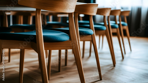 Modern wooden chairs with teal velvet cushions arranged around a table, showcasing elegant design and interior decor.