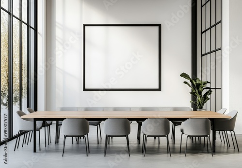 Modern wooden dining table with gray chairs set in an empty white room with a large framed picture on the wall.