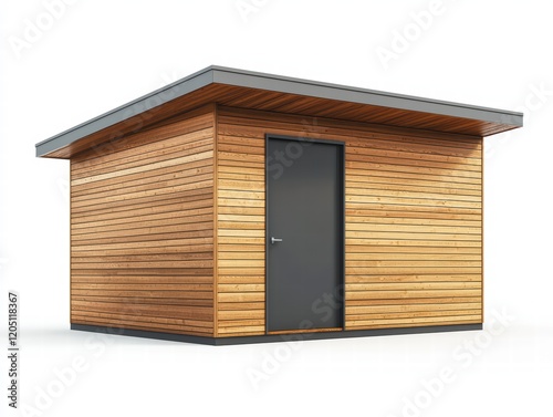 Modern Wooden Garden Shed: A sleek, contemporary garden shed with a flat roof and light brown wooden cladding, perfect for storage or a home office. The gray door adds a touch of modern contrast.