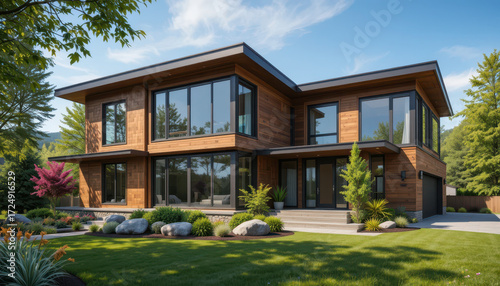 Modern wooden house exterior residential area architectural photography sunny day eye-level view contemporary design