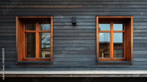 Modern Wooden House Facade with Square Windows and Dark Wall