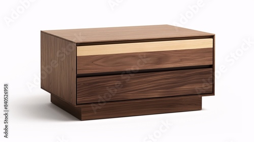 Modern wooden nightstand with two drawers, featuring a sleek design and rich wood grain for contemporary bedroom decor.