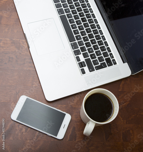 Modern workspace. A laptop with mobile phone and a cup of coffee on a wooden table. Engineer and designer concept image.