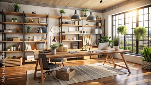 Modern workspace cluttered with design tools, materials, and architectural sketches on wooden desk and shelves in a professional office or studio setting.