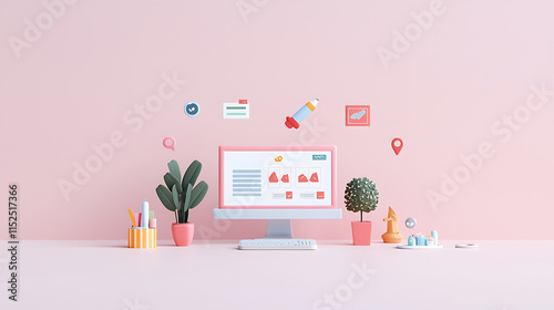 modern workspace featuring computer, plants, and colorful decor, ideal for digital marketing