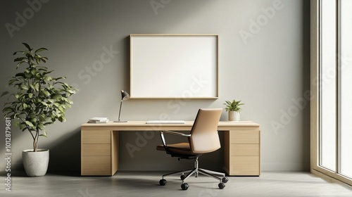 Modern workspace with a desk, chair, plant, and empty frame on the wall.