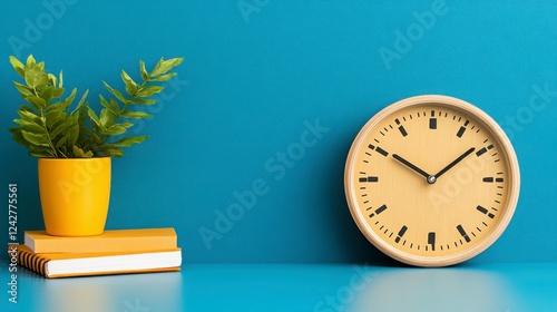 Modern Workspace with Clock and Green Plant on Vibrant Background