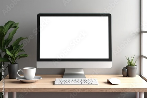 Modern Workspace with Computer, Keyboard, Mouse, and Plants - Home Office Setup