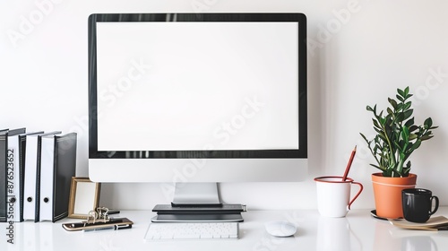 Modern Workspace with Desktop Computer, Office Supplies, and Cup of Coffee on Organized Desk, White Wall with Empty Frame for Copy Space