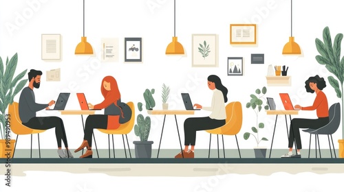 Modern Workspace with Diverse Group of People Working on Laptops in Cozy Office Setting