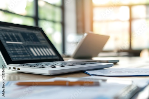 Modern workspace with laptop and documents. Concept of business, productivity, and technology.