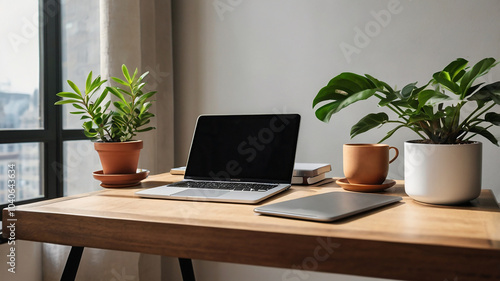 Modern workspace with laptop, coffee cup, notebook and plant on wooden desk generated with AI.