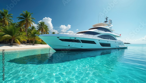 Modern yacht moored off tropical island coast. Luxury boat near calm turquoise ocean and white sand beach with palms. Perfect summer holiday getaway for relaxation and vacation.