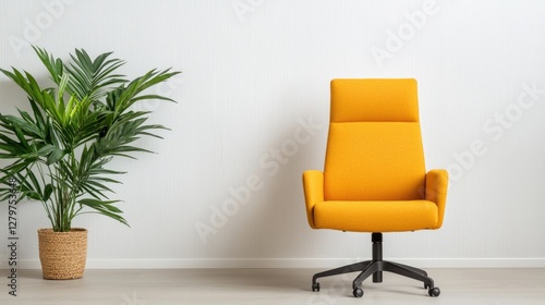 Modern yellow office chair in a bright room with plant. Potential use in home decor, office furnishing catalogs