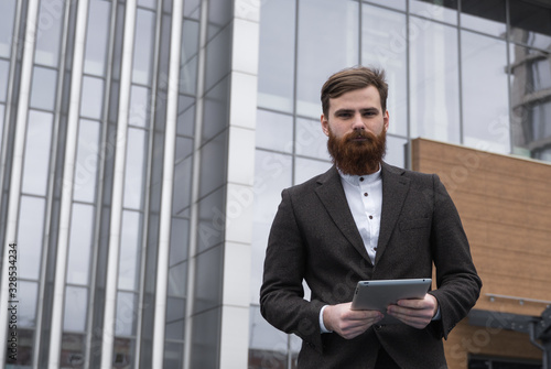 Modern Young bearded Business man standing with a digital tablet. Young hipster businessman holding tablet in hands outdoor. Working online with a tablet while standing outside on an office building.
