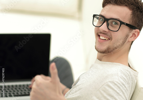 modern young sitting in front of the open laptop and showing thumb up