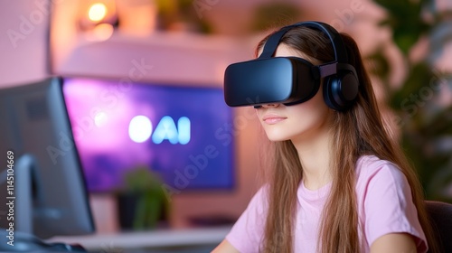 Modern young woman using advanced virtual reality headset in a dynamic tech-themed workspace illuminated by glowing AI-inspired neon accents
