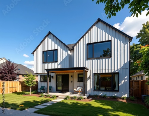 Modern zinc-clad twin house, sunny day, modern, architecture