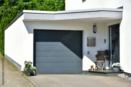 Moderne Beton-Garage mit Automatik-Tor in der Hauszufahrt