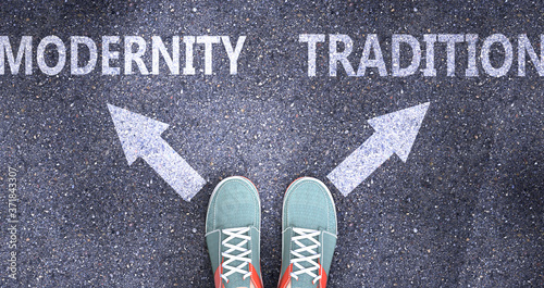 Modernity and tradition as different choices in life - pictured as words Modernity, tradition on a road to symbolize making decision and picking either one as an option, 3d illustration