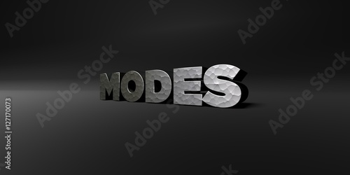MODES - hammered metal finish text on black studio - 3D rendered royalty free stock photo. This image can be used for an online website banner ad or a print postcard.