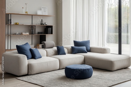 Modular sofa with blue pillows near shelving unit against window with curtain. Minimalist home interior design of modern living room, Generative AI