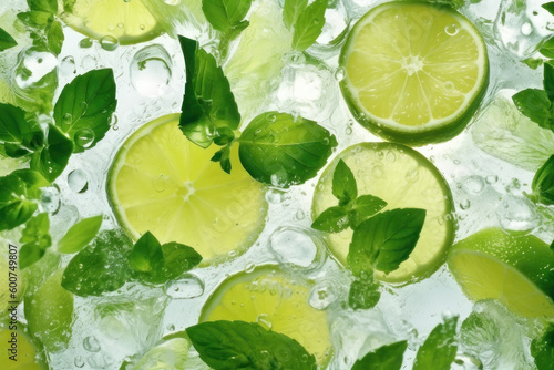 Mojito. Lime slices, mint leaves and water splashes on white background. AI generative.