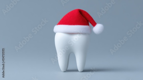 Molar tooth wearing a festive Santa hat against a neutral background during the holiday season. Christmas and New Year. Winter Wonderland