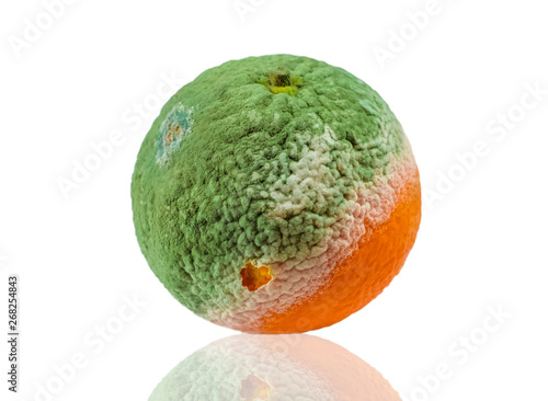 Moldy mandarin. Spoiled tangarine with green mold and fungus. Rotten fruit. Isolated on white background with soft mirror reflection from below.