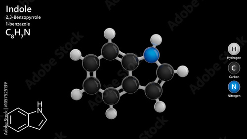 Molecule: Indole. Aromatic heterocycle. Molecular structure. Formula: C8H7N. Chemical model: Ball and stick. Black background. 3D illustration.