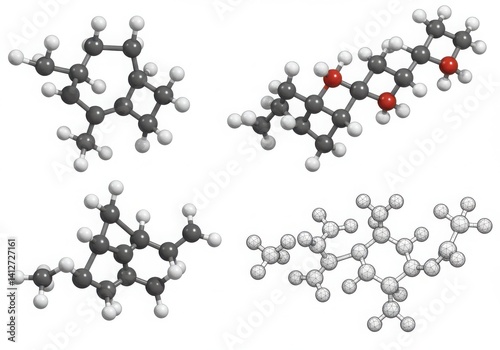 Molecules displayed with atoms and bonds in a scientific setting isoleted on white background