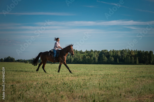 Молодая красивая тёмноволосая девушка скачет на лошади по летнему полю.