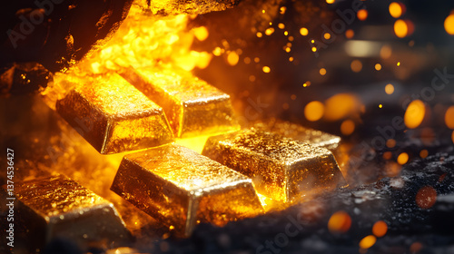 Molten gold flowing from an industrial smelting furnace into molds to create shiny gold bars, with sparks and high heat visible in the process.