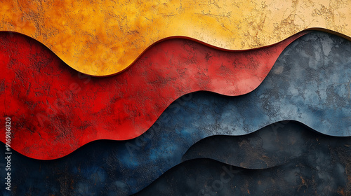Molten Hues in Abstract Flow: A captivating wave pattern of textured red, orange, and blue evokes a sense of fluid motion and vibrant energy.