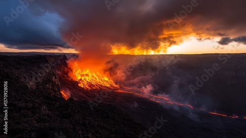 Molten lava flowing from volcanic crater with extreme heat distortion and glowing red textures