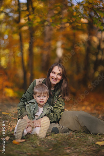 Mom and children walk in the park and enjoy the beautiful autumn nature. Happy family on an autumn walk. Natural Park. Family active holiday concept.