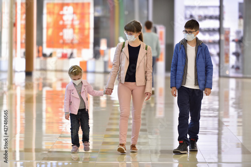 Mom and children wearing face masks walk through the shopping center during the COVID-19 pandemic.