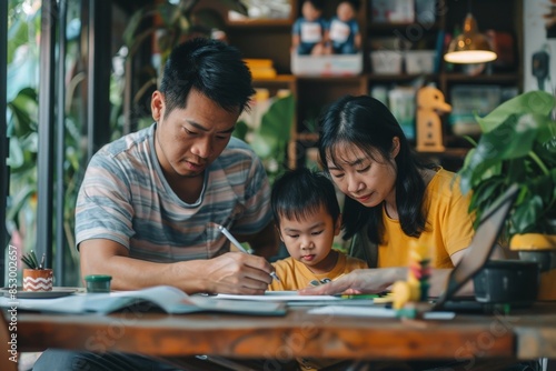 Mom and dad diligently explaining lessons to their son, sitting at a table with books and notebooks