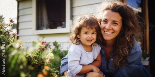 Mom and daughter spend time in the garden at their home. Generative AI.