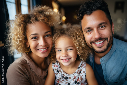 Mom, dad and daughter smile and look at the camera.