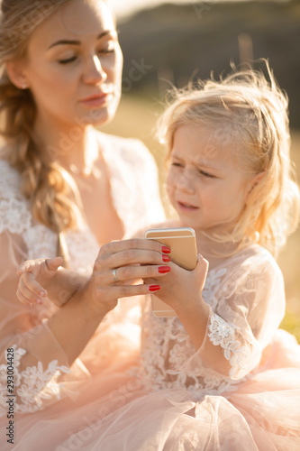 Mom gives her little daughter, who cries in her hands, a phone to calm down