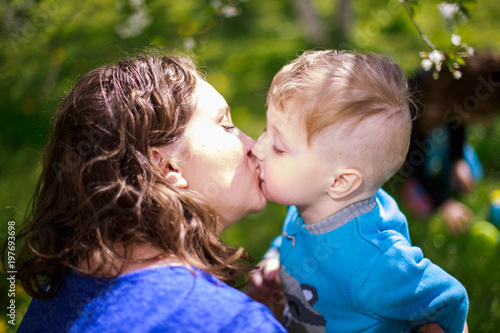 Mom kisses her son. A little boy next to a woman. Happy family on a spring walk.