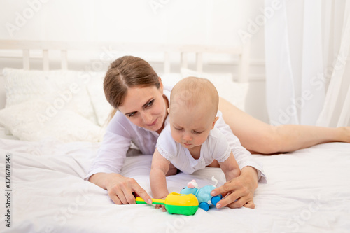 mom playing with baby 6 months lying on a white bed, leisure mom with baby, place for text