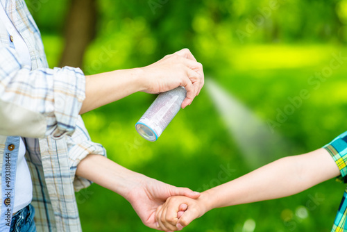 Mom spraying repellent on her son's skin to protect against mosquitoes while cycling in the park. Close-up