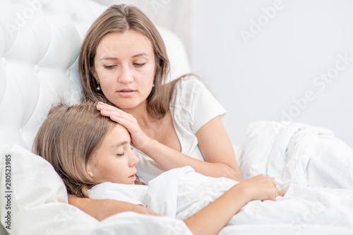 Mom takes care of her sick daughter, touches her forehead, checking the temperature