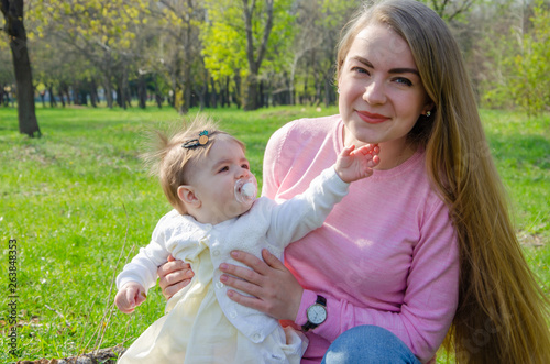 Mom with baby in bright clothes on a pink plaid on the green right. Family resting in the park on a warm day. Mom and little girl 10 months walk in the park