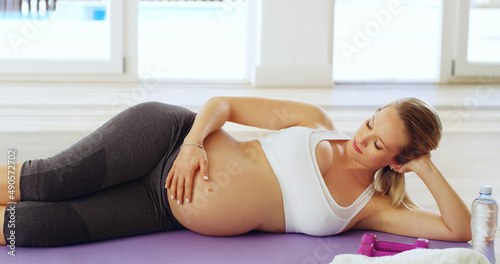 Mommy cant wait to meet you. Cropped shot of an attractive young pregnant woman lying on her side on a yoga mat.