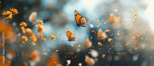 Monarch butterflies dance gracefully among sunlit orange flowers in a dreamy, enchanted forest.