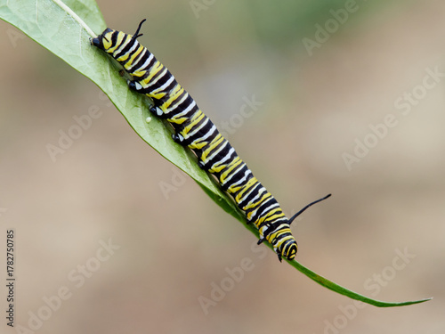 Monarch butterfly caterpillar Danaus plexippus on its host plant milkweed (genus Asclepias)