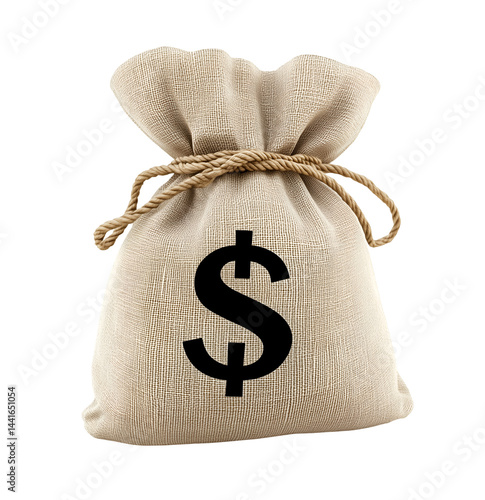 Money Bag Symbol: A burlap money bag with a prominent dollar sign symbol printed on it, suggesting wealth, finance, and prosperity.